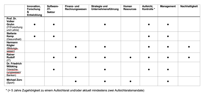 Darüber hinaus hat der Aufsichtsrat für seine Zusammensetzung in Einklang mit dem Grundsatz 11 des DCGK bestimmt, dass seine Mitglieder insgesamt über die zur ordnungsgemäßen Wahrnehmung der Aufgaben erforderlichen Kenntnisse, Fähigkeiten und fachlichen Erfahrung verfügen und in ihrer Gesamtheit mit dem Geschäftsmodell und Zielmärkten der Gesellschaft vertraut sind. Gemäß der Empfehlung C.1 DCGK hat der Aufsichtsrat 2023 erstmals auch konkrete Ziele für die Zusammensetzung des Aufsichtsrats und ein Kompetenzprofil für das Gesamtgremium beschlossen. Der Aufsichtsrat hat das Kompetenzprofil zuletzt im März 2025 aktualisiert. Das Kompetenzprofil umfasst auch Expertise zu den für das Unternehmen bedeutsamen Nachhaltigkeitsfragen. Das Kompetenzprofil enthält sowohl Anforderungen an die einzelnen Aufsichtsratsmitglieder als auch Anforderungen an das Gesamtgremium und ist auf der Website von adesso unter www.adesso-group.de/corporate-governance/ abrufbar. Bei der Beratung seiner Vorschläge an die Hauptversammlung zur Wahl von Aufsichtsratsmitgliedern berücksichtigt der Aufsichtsrat im Rahmen des von ihm festgelegten Kompetenzprofils insbesondere die Fach- und Branchenkenntnis, die Unabhängigkeit, die internationale Tätigkeit des Unternehmens sowie Kriterien der Vielfalt (Diversity). Die aktuelle Zusammensetzung des Aufsichtsrats entspricht dem Kompetenzprofil für den Aufsichtsrat und erfüllt die darin benannten Ziele für die Zusammensetzung des Gremiums. Der Stand der Umsetzung des Kompetenzprofils wird im Sinne der Empfehlung C.1 des Kodex in Form der folgenden Qualifikationsmatrix offengelegt. Die Bewertung in der Qualifikationsmatrix beruht auf einer Selbsteinschätzung der einzelnen Aufsichtsratsmitglieder unter Berücksichtigung der Anforderungen, die das Kompetenzprofil für die einzelnen Kenntnisse, Fähigkeiten und fachlichen Erfahrungen aufstellt.