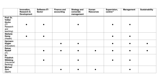 In addition, the Supervisory Board has determined for its composition in accordance with Principle 11 of the GCGC that its members as a group possess the knowledge, ability and expert experience required to properly perform their duties and that they are familiar as a group with the business model and target markets of the company. In accordance with recommendation C.1 of the German Corporate Governance Code, the Supervisory Board also set specific targets for the composition of the Supervisory Board and a profile of skills and expertise for the board as a whole for the first time in 2023. The Supervisory Board last updated the profile of skills and expertise in March 2025. The profile of skills and expertise also includes expertise on sustainability issues that are material to the company. The profile of skills and expertise contains requirements for both individual members of the Supervisory Board and the Supervisory Board as a whole and can be viewed on the adesso website at www.adesso-group.de/corporate-governance/. When deliberating on its proposals to the Annual General Meeting for the election of Supervisory Board members, the Supervisory Board, in the context of the profile of skills and expertise it has defined, takes particular account of specialist and industry knowledge, independence, the company's international activity and criteria of diversity. The current composition of the Supervisory Board corresponds to the profile of skills and expertise for the Supervisory Board and fulfils the objectives specified therein for the composition of the body. The implementation status of the profile of required skills and expertise is published in the form of the following skills matrix in accordance with recommendation C.1 of the Code. The assessment in the skills matrix is based on a self-assessment by the individual members of the Supervisory Board, taking into account the requirements set out in the profile of required skills and expertise for the individual areas of knowledge, skills and professional experience.